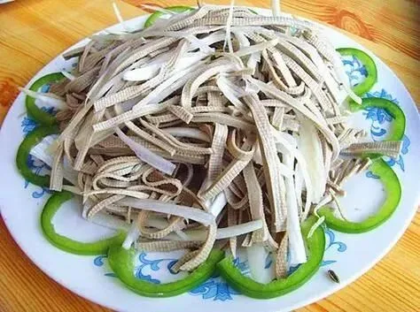 豆腐压成干,片成丝,细的跟头发似的,一根根不断。