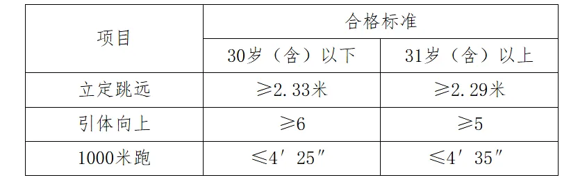 体能测试内容为立定跳远、引体向上、1000米跑三个项目,评分标准参照《河北省公安机关人民警察体育锻炼达标标准》执行。三项测试均达到合格标准视为合格,进入笔试环节。