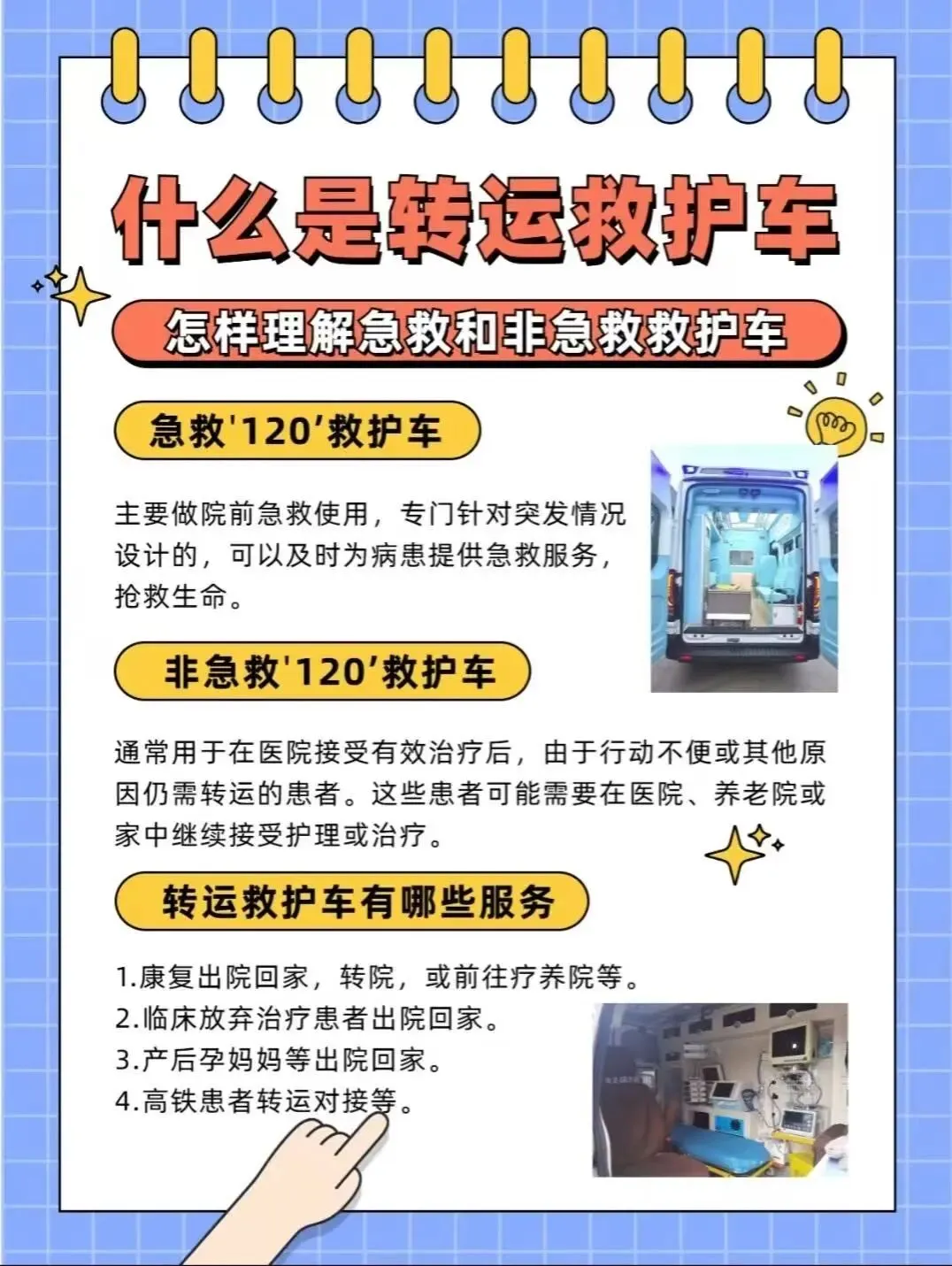 我们是120救护车出租转运咨询服务公司。作为专业120接送病人服务机构,我们专注长途跨省转诊转运,覆盖出院转院、高铁飞机转运、非急救转运等全场景需求。收费每公里7左右。