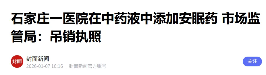 时隔7个月,调查结果如何?2026年1月7日,大斌告诉封面新闻记者,桥西区市场监管局确认了普泽中医院在中药液中非法添加地西泮的行为,医院被吊销营业执照。同时,该院因非法行医,被卫健部门吊销执照,罚款10万元。