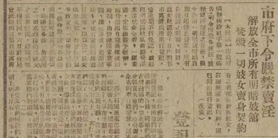 现石门已获解放,此种邪恶制度自应取消。本市政府为革除荒淫恶习,端正社会风气,挽救妓女跳出火坑,俾其能改业从良,特明令解散各色妓女馆,严禁卖淫制度之存在,所有加予妓女的一切卖身契约,一律宣布作废。此限令全市一切明妓暗娼自即日起停止营业,所有各色妓馆之经理、老鸨、伙计、妓女统限于十日内到新市区派出所进行登记,不得规避,各妓馆经理、老鸨所执掌之妓女卖身契约一律交出焚毁;各妓女所应用之一切衣、饰、家具统统确定为妓女之私有财产,经理、老鸨不得收回。尚逾期不进行登记或经理,老鸨胆敢私自经营淫业,违抗命令者,一经查获,定当依法严惩。