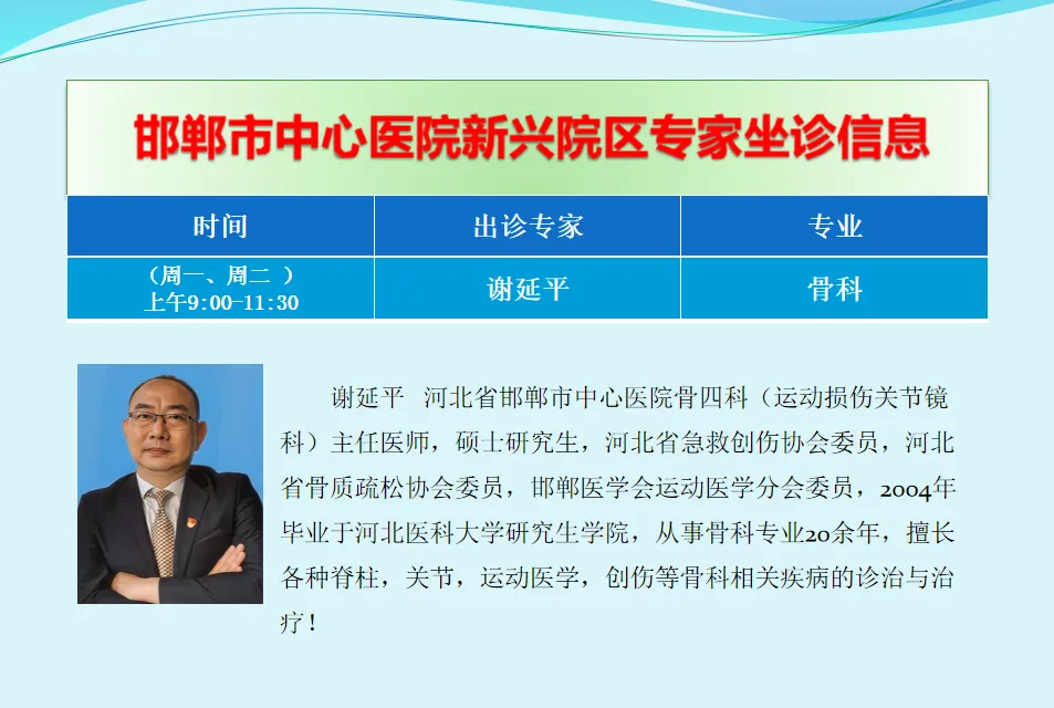 邯郸市中心医院新兴院区的专家团队,是由邯郸中心医院的知名专家组成,包括内科、外科、骨科、妇产科、麻醉科等,专家团队成员均具有高学历、高职称学位和高精的医疗技术水平。有主任医师、副主任医师、教授博士、研究生、研究生导师,他们在各自医疗专业领域中都具有很高的影响力!