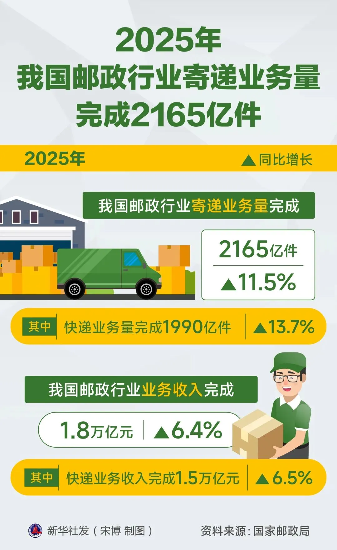 2.2025年我国邮政行业寄递业务量完成2165亿件,同比增长11.5%。(新华社)