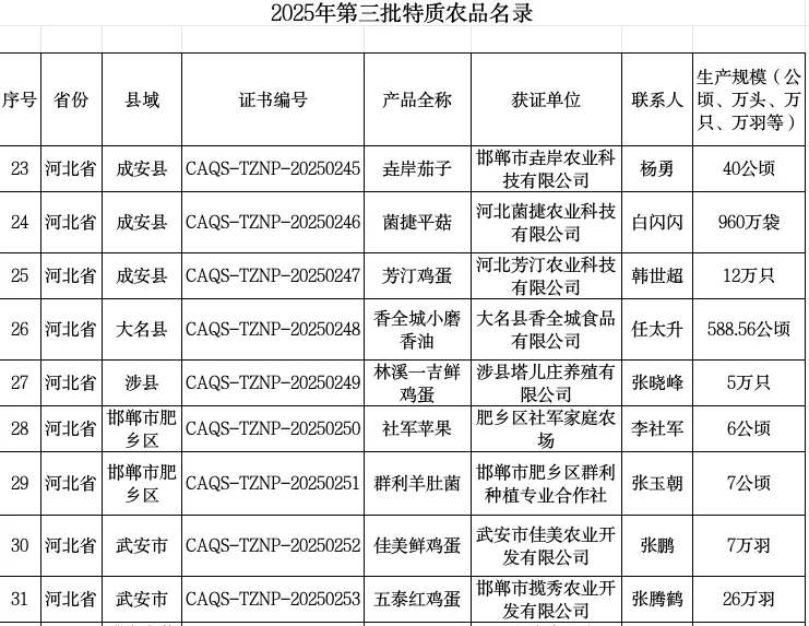 近日,农业农村部公布2025年第三批全国名特优新农产品及特质农品名录(名特优新是以县政府名义申报的,授权相关若干个企业使用这个称号。特质农品是以企业名义申报,只能用于本企业使用这个称号。),邯郸市共有14个农产品入选。其中,临漳韭菜、成安平菇等5个产品获评全国名特优新农产品,芳汀鸡蛋、香全城小磨香油等9个产品被认定为特质农品。