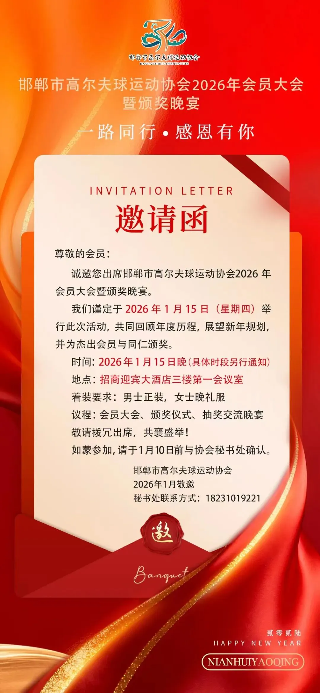诚邀您出席邯郸市高尔夫球运动协会2026年会员大会暨颁奖晚宴。