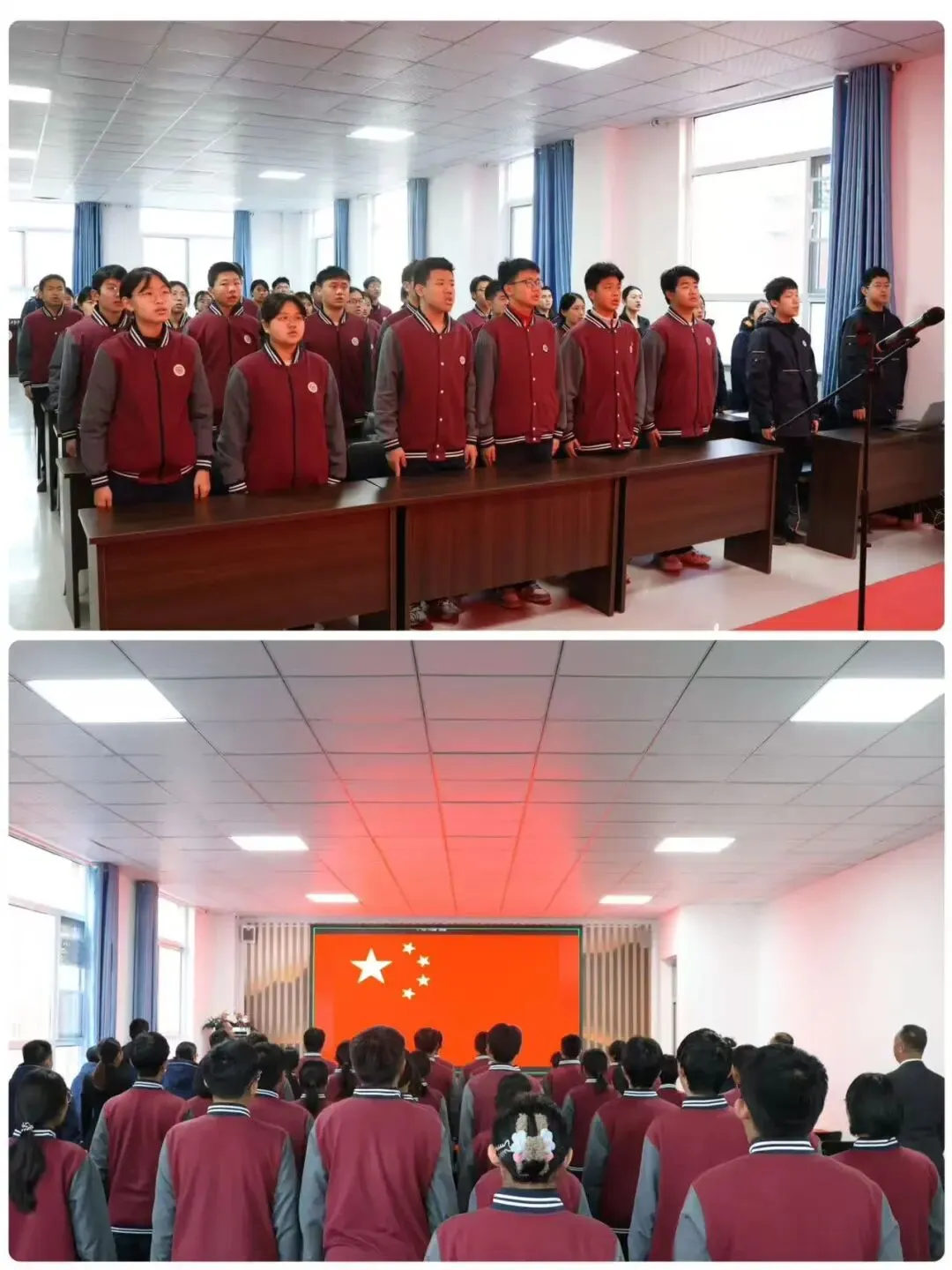 激昂雄壮的国歌声通过直播设备响彻校园的每个角落。主会场及各班级师生纷纷起身肃立,昂首挺胸,目光坚定而炽热;整齐嘹亮的歌声,饱含着师生对祖国的无限热爱。