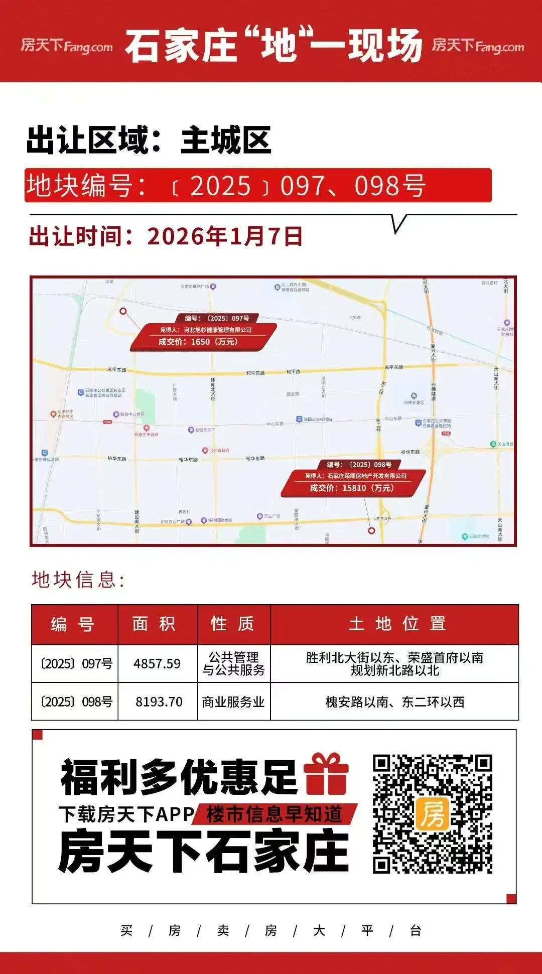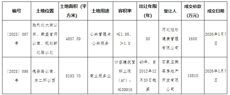 位于槐安路以南、东二环以西的〔2025〕098号商服地块以15810万元成交,竞得人石家庄荣阁房地产开发有限公司。