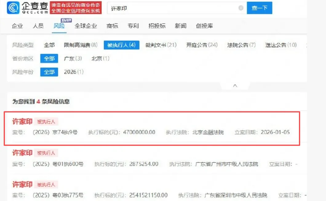 许家印又双叒叕被执行!据企查查显示,1月5日,