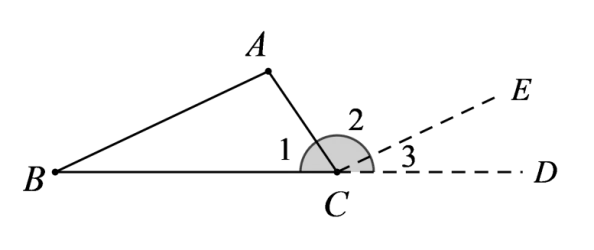 证法2:如图,延长 到 ,过点 作 . ∴ (两直线平行,内错角相等) (两直线平行,同位角相等)