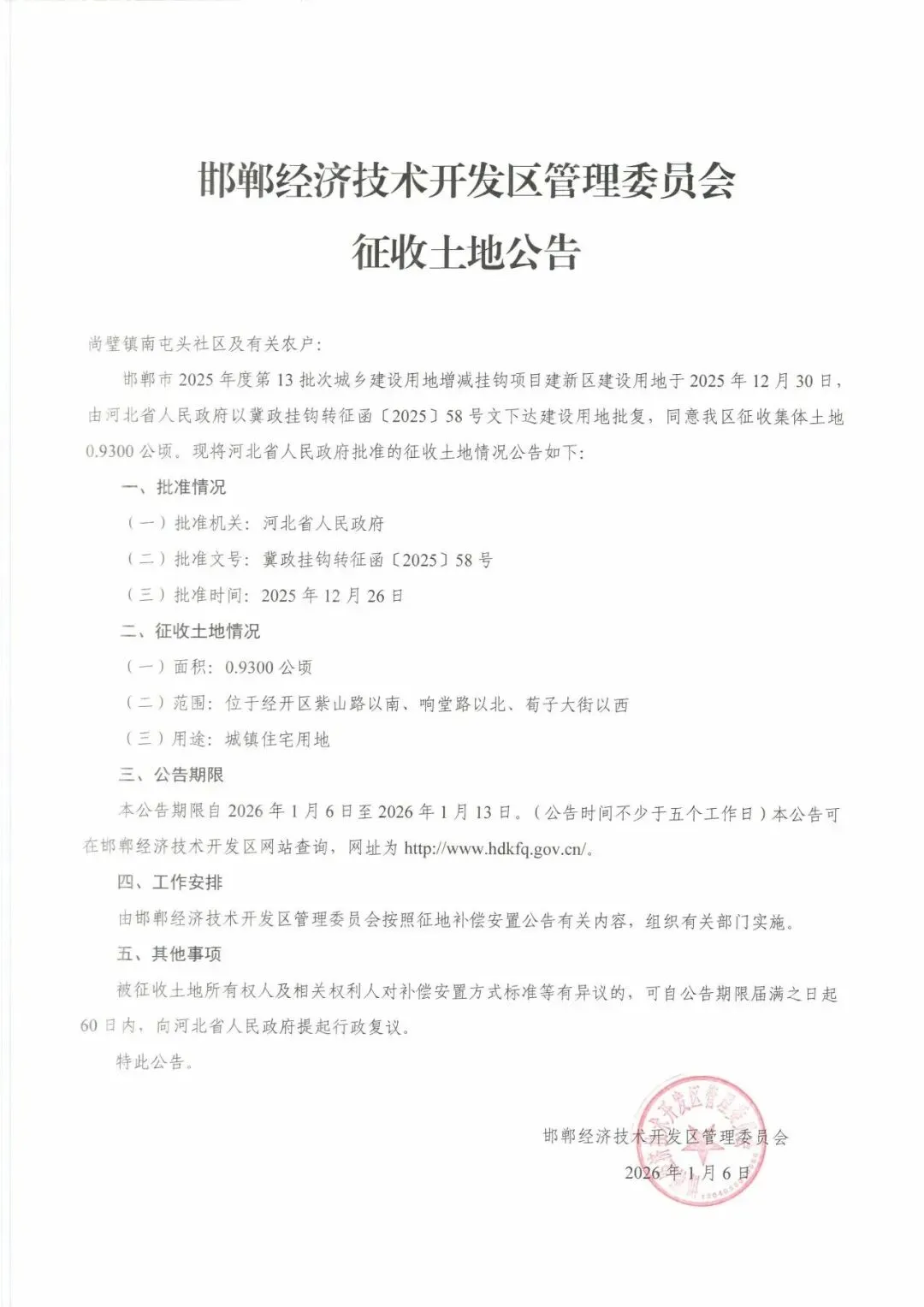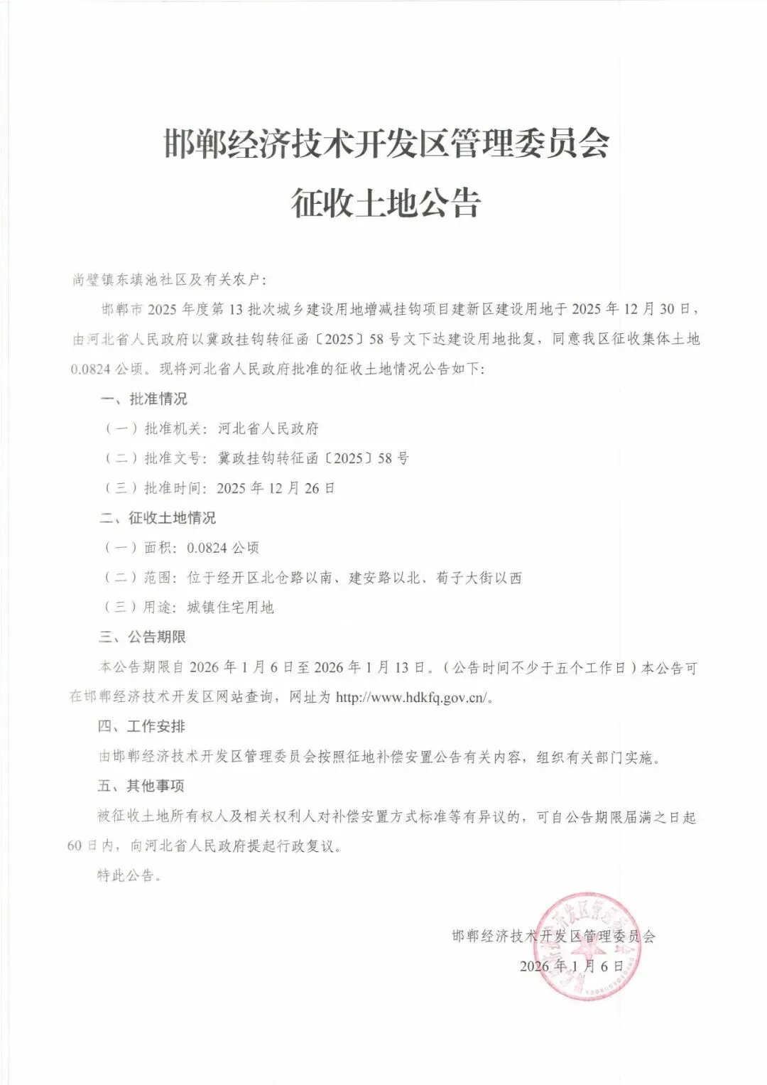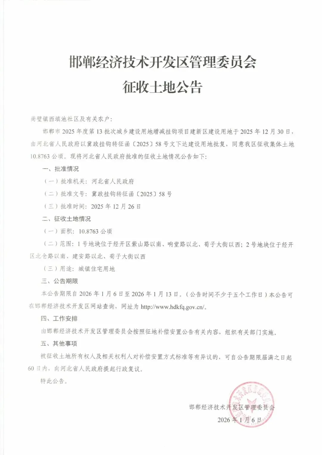 公告明确,本次征收公告期限为2026年1月6日至2026年1月13日(不少于五个工作日),市民可通过邯郸经济技术开发区官网(http://www.hdkfq.gov.cn/)查询详细信息。邯郸经济技术开发区管理委员会将按照征地补偿安置公告要求,组织相关部门推进实施工作。