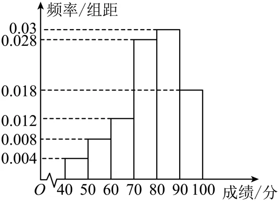18. 暑假期间,儿童溺水现象屡有发生,防溺水工作十分重要.现从某社区随机抽取100名居民,对他们的防溺水认识程度进行了测评,经统计,这100名居民的测评成绩全部在40至100之间,将数据按照分成6组,制成如图所示的频率分布直方图.