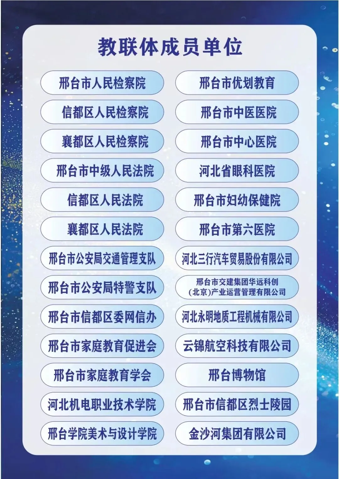 为积极响应家校社协同育人的时代号召,汇聚更广泛的教育力量,邢台一中教联体即将正式成立。我校旨在携手社会各界优质资源,共同搭建一个全方位、多元化的学生成长平台。