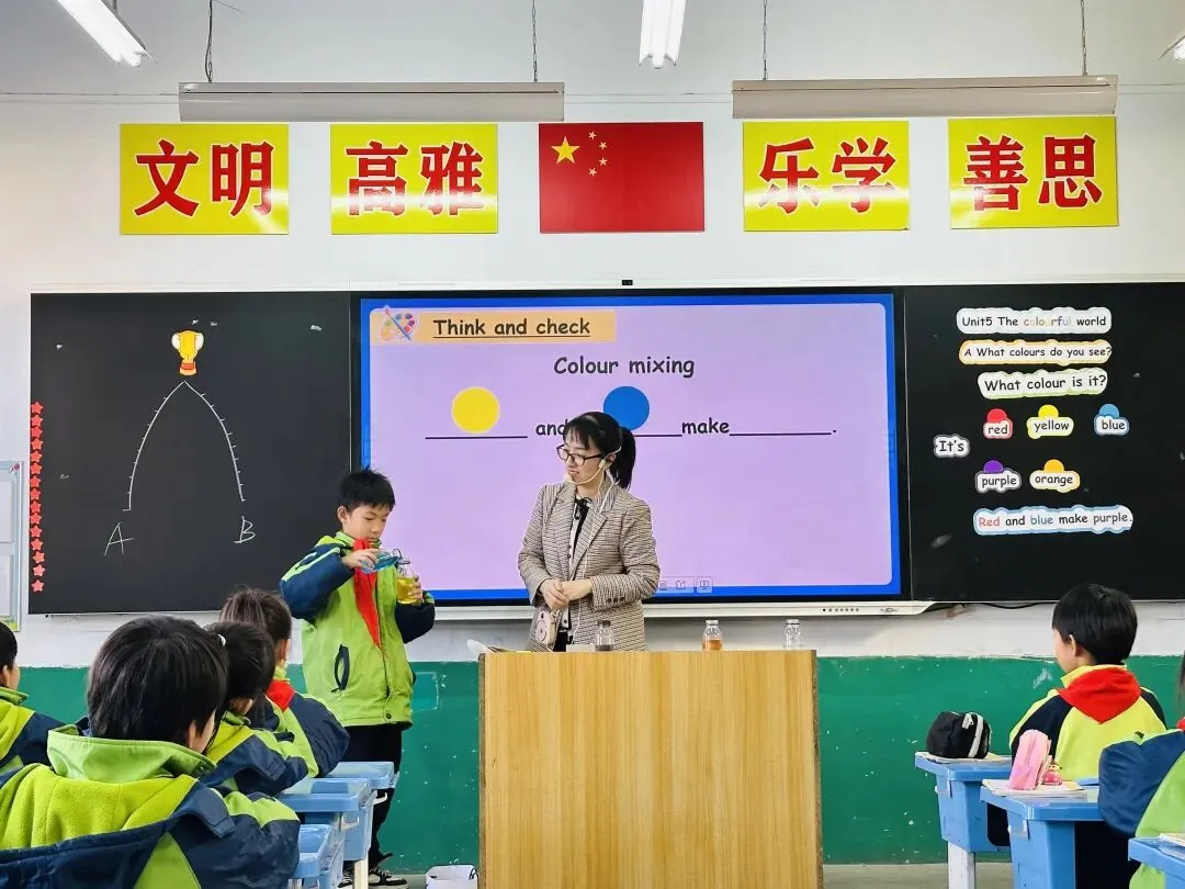 活动伊始,工作室成员、郭守敬小学教师睢婧为三年级学生呈现示范课《Unit 5 The colourful world》。课堂上,睢老师以“colour”为主题,融合化学、美术、科学知识,通过趣味科学实验引导学生观察溶液色彩变化,同步教授“red”“blue”等颜色单词,并拓展美术色彩搭配、科学色彩成因知识。学生在动手操作、观察表达中轻松掌握词汇,激发了英语学习热情,提升了跨学科思维与实践能力,彰显了深化课程改革的育人初心。