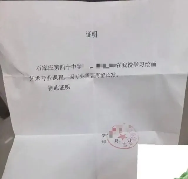 该学生发布的“证明”写道,“石家庄第四十中学某班某学生在我校学习绘画艺术专业课程,因专业需要需留长发。”随后,该生又发布了一份“保证书”,配文称“尘埃落定”。保证书内容显示,“本校某学生,因以后参加艺术考试,需留长发。在校留发期间定遵守校规校纪。如有违反,自愿剪发。”该保证书右下方有学生、家长及班主任签字,并盖有学校公章。