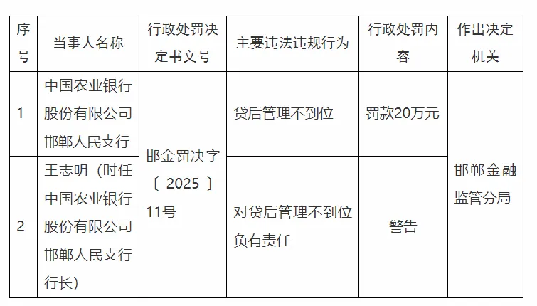 中国农业银行股份有限公司邯郸人民支行贷后管理不到位,罚款20万元。