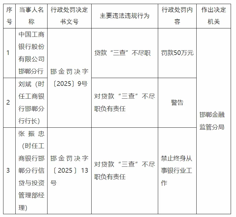 中国工商银行股份有限公司邯郸分行贷款“三查”不尽职罚款50万元。