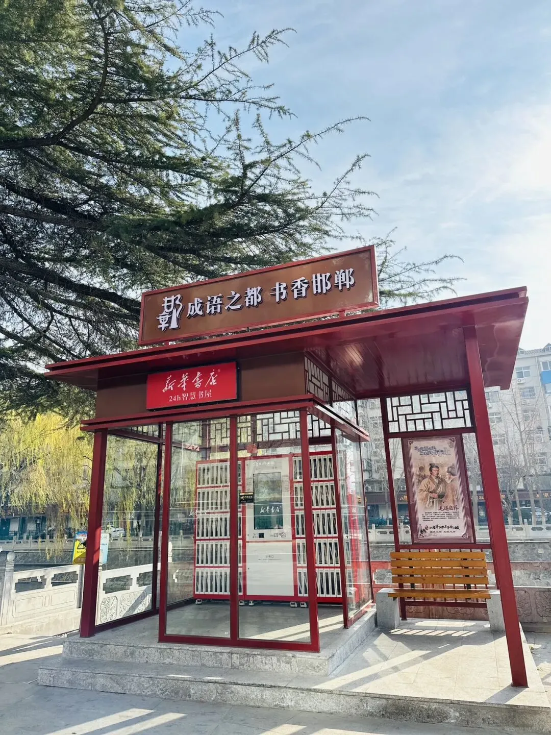 红漆木架搭配中式窗格,“成语之都 书香邯郸”的牌匾往那儿一立,古韵直接拉满。这可不是普通的书屋,是新华书店打造的24h智慧书屋,就藏在邯郸的公园景区里,免费借阅、随时打卡,主打一个文化氛围感拉满~