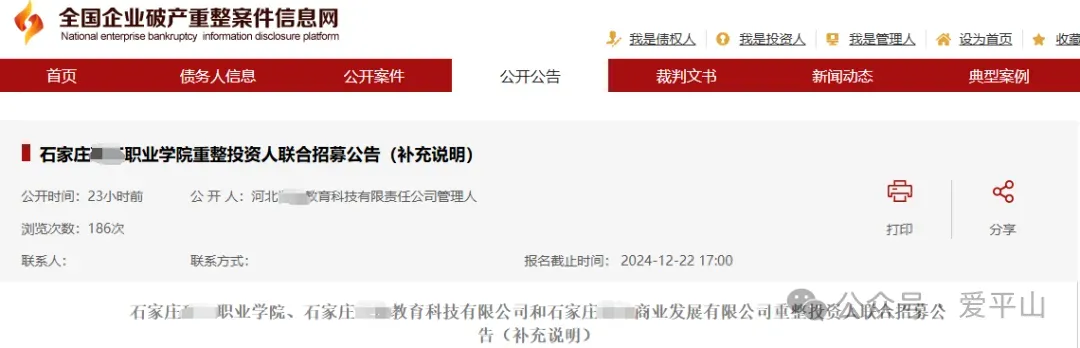 石家庄市中级人民法院于2025年7月30日、2025年8月19日和2025年9月2日,分别裁定受理石家庄某职业学院(以下简称“某学院”)、石家庄某教育科技有限公司和石家庄某商业发展有限公司的破产重整申请,指定石家庄某职业学院清算组为学院管理人,石家庄某教育科技有限公司清算组为该教育管理人,石家庄某商业发展有限公司清算组为该商业管理人。