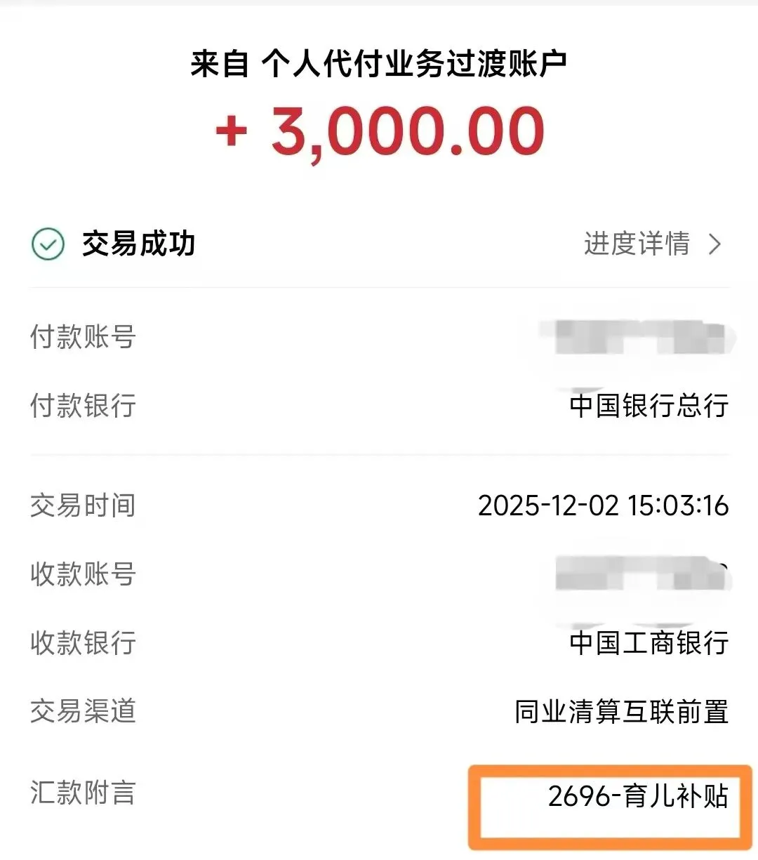 二宝去年刚满3周岁,踩着边能领到育儿补贴,每月300块钱。