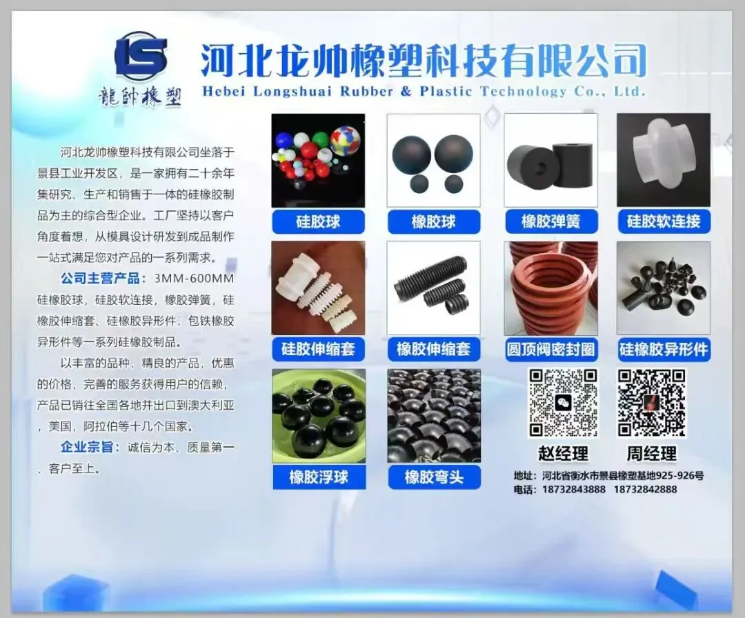 公司主营产品:3MM-600MM硅橡胶球,硅胶软连接,橡胶弹簧,硅橡胶伸缩套,硅橡胶异形件,包铁橡胶异形件等一系列硅橡胶制品。