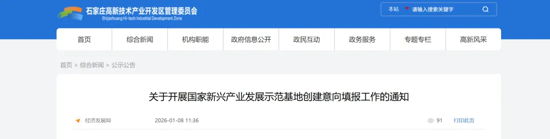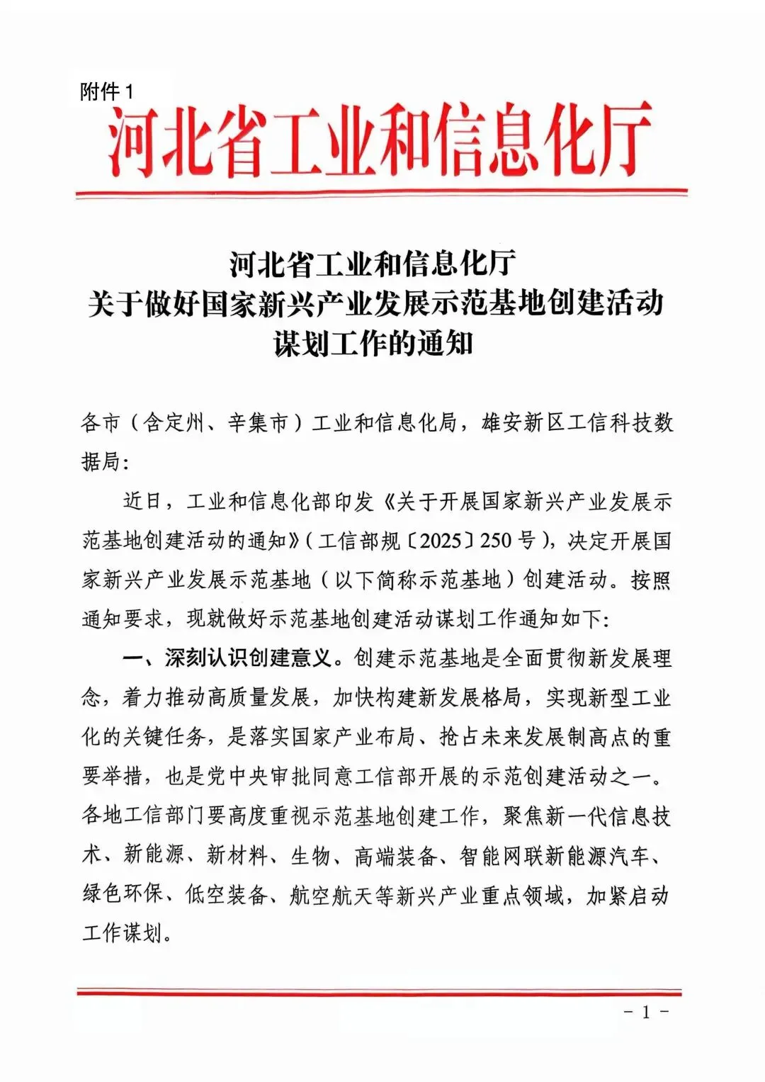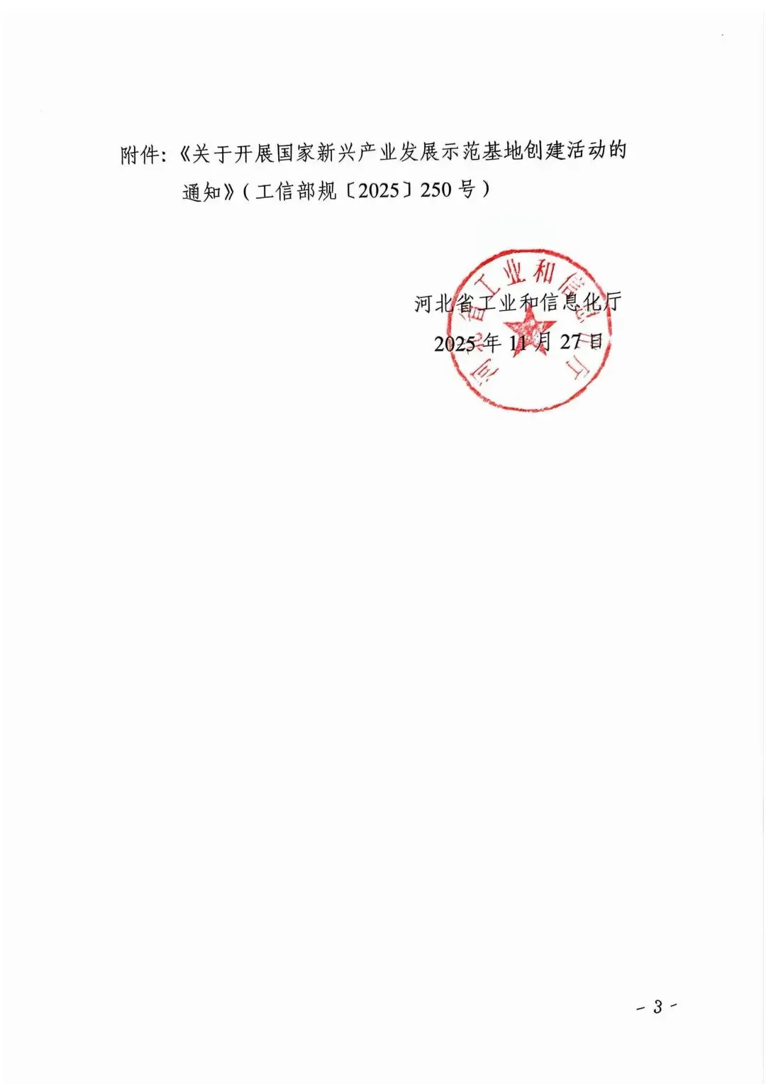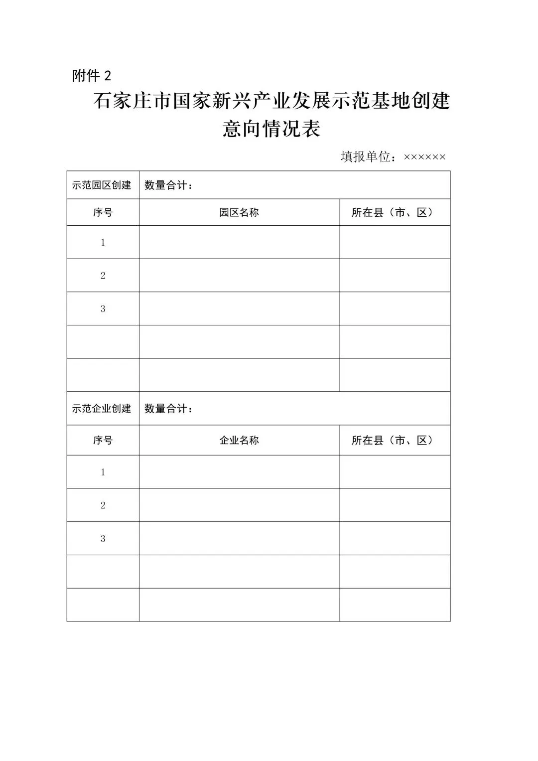 按照市工业和信息化局《关于开展国家新型产业发展示范基地创建意向填报工作的通知》,请有意愿申报的企业,积极填报石家庄市国家新兴产业发展示范基地创建意向情况表,并于1月8日15点前加盖单位公章反馈邮箱jfjgxk2025@163.com。