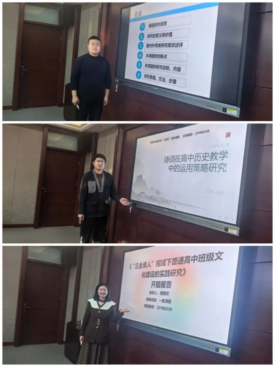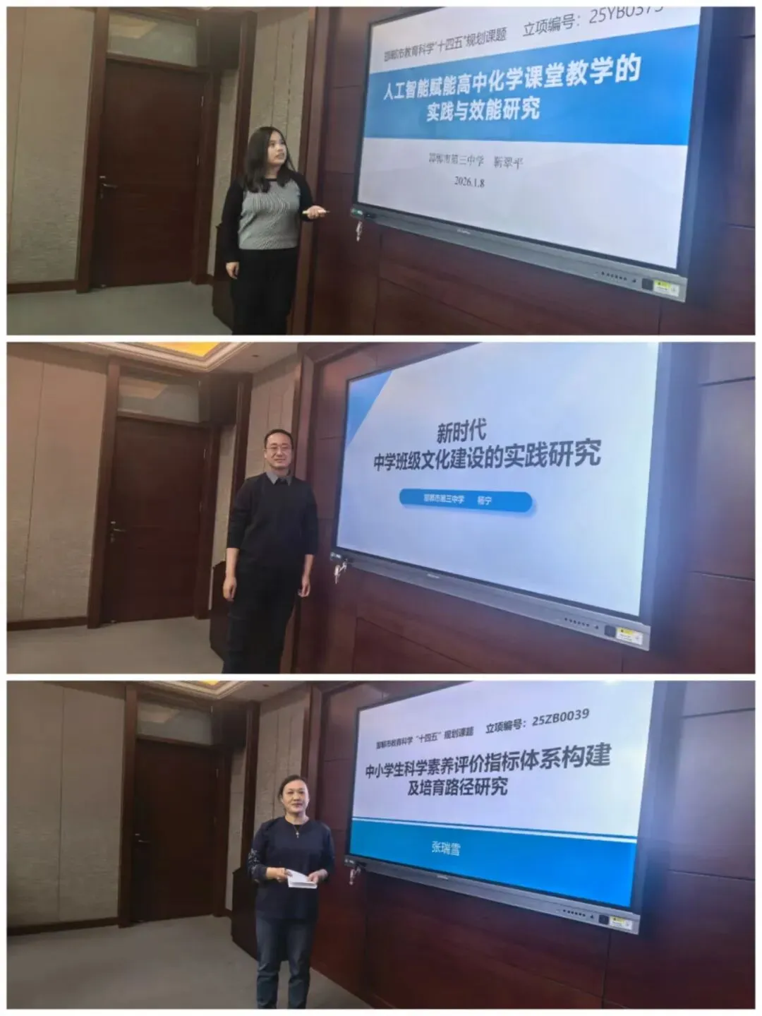 随后教发处孙金华主任详细介绍了开题流程,九位课题主持人依次登台陈述,从研究目标、内容、思路、方法等方面展开详细汇报。9项课题研究领域覆盖德育建设、学科教学、班级管理、人工智能教育应用等多个维度,充分展现了三中教师深耕教育教学、勇于探索创新的专业精神。