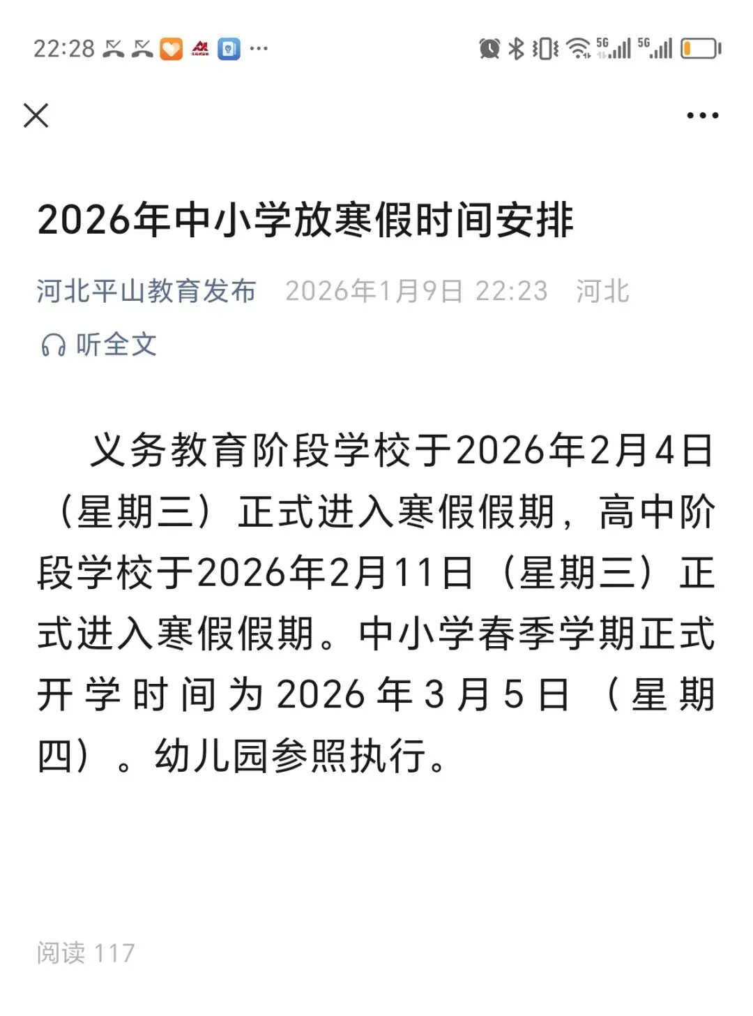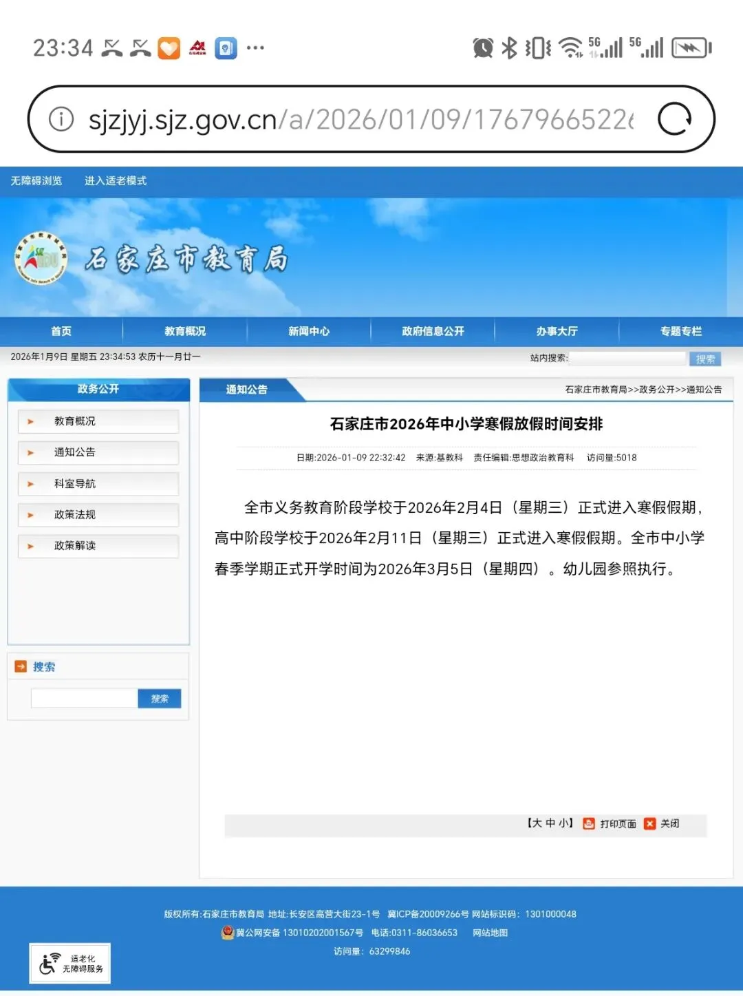 石家庄市2026年中小学寒假时间安排:全市义务教育阶段学校于2026年2月4日(星期三)正式进入寒假假期,高中阶段学校于2026年2月11日(星期三)正式进入寒假假期。全市中小学春季学期正式开学时间为2026年3月5日(星期四)。幼儿园参照执行。