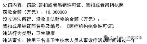 同年6月,桥西区卫生健康局也对该院作出了罚款10万元,暂扣或吊销许可证、执照的处罚。其违法事实为“使用三名非卫生技术人员从事诊疗活动时间超过一年”。