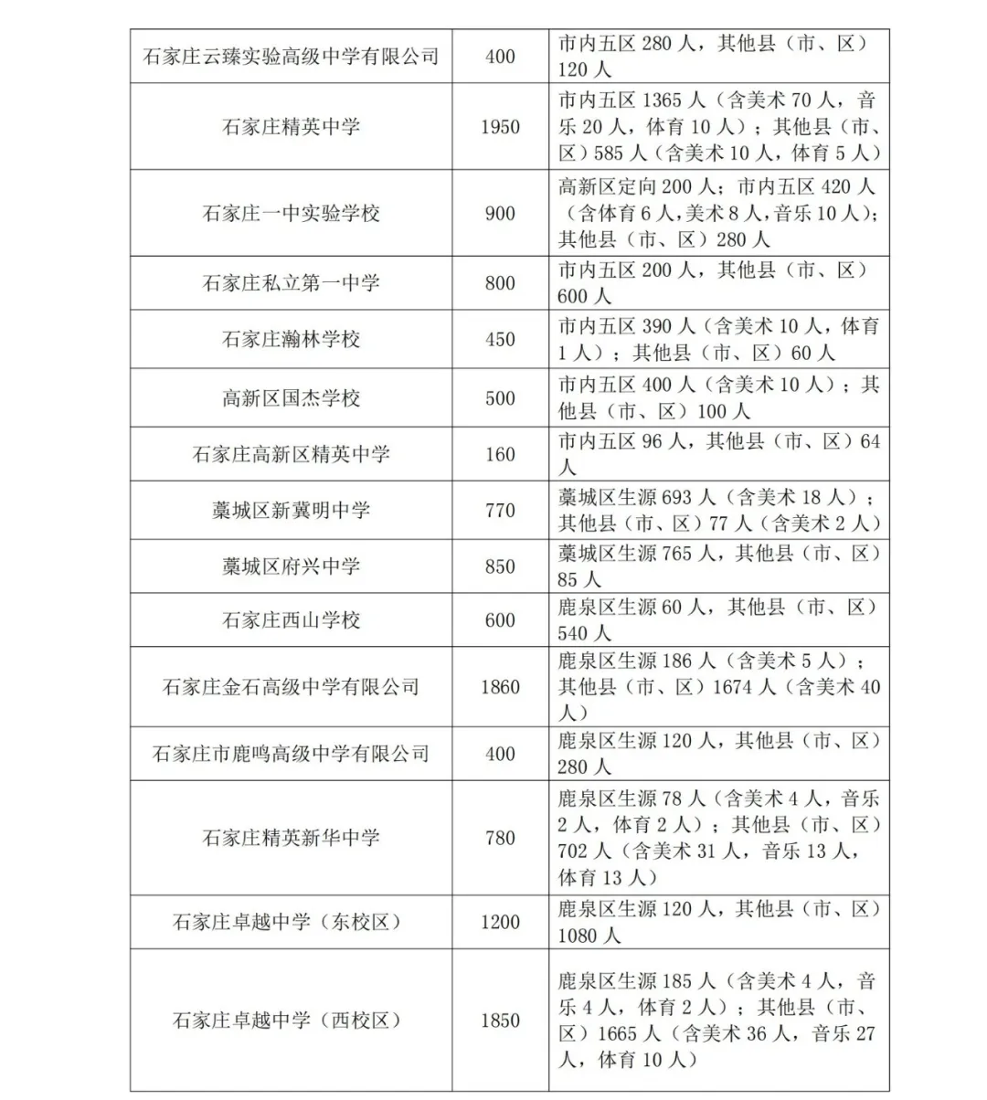 其次,一般我们来讲录取率这个概念时,是用录取or招生人数/报考人数来计算得出,但这个数据其实很难计算。石家庄中考招生按照招生范围的不同,普通高中可以分为四类,1、市区公办,招生范围主要是主城区;2、驻县四校,招生范围主要是主城区外其余县区;3、县域高中,招生范围主要是本县、区;4、民办高中,石家庄地区均可招生,含市区和郊县。比如我们要计算市区普高录取率,首先要汇总①市区公办高中招生计划+②驻县四校市区单列计划+③民办高中市区招生计划三部分总人数,①②根据教育局公布的招生计划很容易得出,但由于2025年石家庄民办高中开始“划片分比例招生”,市区民办有单独的市区、郊县招生计划,而县域民办则是分为学校所在地和其余县区两部分,并没有针对市区的具体招生人数,也就导致③民办高中市区招生总人数这个数据很难准确。继而想要得到较为精确的市区普高率也就无从谈起。