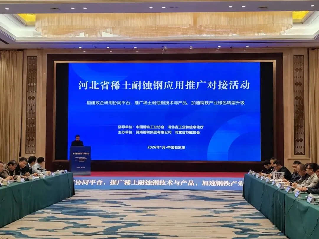 2025年以来,河北省政府将稀土耐蚀钢列为全省钢铁十大拳头产品之一。2026年1月6日,中国钢铁行业协会成立“稀土钢应用推广工作组”,全力推广稀土耐蚀钢,河北省被列为首个试点省份。本次对接活动聚焦“政产学研用”协同,在河北省率先建立稀土耐蚀钢生产和使用试点,为下一步全国推广做好示范。