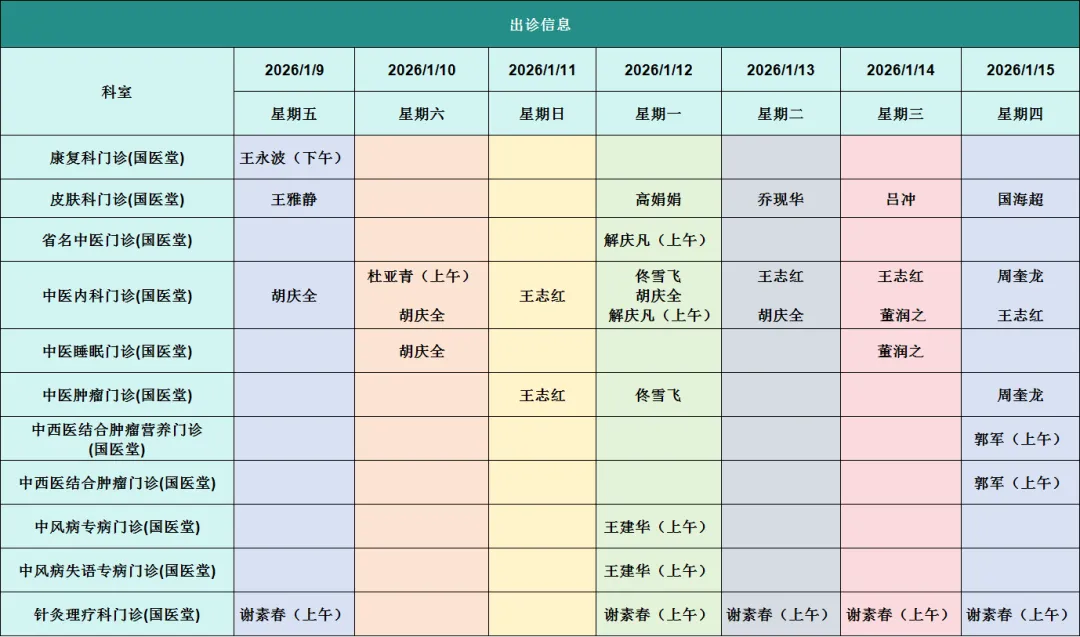 出诊信息(1月9日-1月15日)
