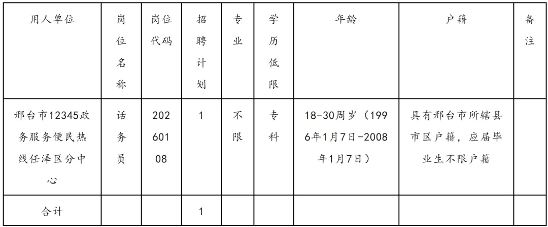 根据工作需要,受邢台市12345政务服务便民热线任泽区分中心委托,河北仁聚人力资源服务有限公司现面向社会公开招聘12345政务服务便民热线工作人员1名,现公告如下:(一)招聘计划及岗位职责公开招聘12345政务服务便民热线工作人员1名,岗位职责主要负责群众来电的接听等工作。查看河北各地最新招聘信息1.具有中华人民共和国国籍,遵守宪法和法律,具有良好的品行和职业道德;2.年龄在18-30周岁(1996年1月7日至2008年1月7日期间出生);3.邢台市所辖县(市、区)户籍,应届高校毕业生不限户籍;7.具有一定的政治素养和政治敏感性,有一定的沟通协调能力;9.具有与招聘岗位要求相适应的年龄、户籍、学历和其他资格条件,详见《邢台市12345政务服务便民热线任泽区分中心招聘工作人员岗位条件表》(附件)。具体招聘人数和岗位条件详见《邢台市12345政务服务便民热线任泽区招聘工作人员岗位条件表》(附件);凡涉及到年龄、户籍等需要确定时间的,计算日期截止到2026年1月7日。(1)纳入国家统招计划、被普通高等院校录取的2025年高校毕业生。(2)国家统一招生的2024年、2025年普通高校毕业生择业期内未落实工作单位,其档案仍保留在原毕业学校,或保留在各级毕业生就业主管部门(毕业生就业指导服务中心)、各级人才交流服务机构和各级公共就业服务机构的毕业生。查看河北各地最新招聘信息(3)参加“服务基层项目”前无工作经历,服务期满且考核合格后2年内未落实工作单位的人员。(4)普通高等院校在校生或毕业当年入伍,退役后(含复学毕业)2年内未落实工作单位的退役士兵。(5)2025年取得国(境)外学位并完成教育部门学历认证的留学回国人员;以及2024、2025年取得国(境)外学位并完成教育部门学历认证且未落实工作单位的留学回国人员。1.现役军人、试用期内的公务员和事业单位工作人员、高校在读生、未满最低服务年限或未满约定最低服务期限的人员、未经本单位及其主管部门同意报考的公务员和事业单位工作人员,不在招聘范围。2.曾因犯罪受过刑事处罚人员、被开除中国共产党党籍的人员、被开除公职的人员、被依法列为失信联合惩戒对象的人员,以及法律法规规定不得招聘为事业单位工作人员的其他情形人员,不得报考。3.此外,应聘人员不得报考聘用后即构成回避关系的招聘岗位。回避关系包括《事业单位人事管理回避规定》第六条和《河北省事业单位公开招聘工作人员暂行办法》第四十一条所列情形。2026年1月8日-2026年1月10日,邢台市12345政务服务便民热线任泽区分中心通过 “985人才信息”微信公众号发布,公告在“985人才信息”微信公众号公布招聘人数、条件以及报名考试有关信息。2026年1月11日9:00—2026年1月17日17:00。2026年1月11日9:00—2026年1月18日17:00。2.报名办法:采取网上报名、资格初审的方式进行,登录报名网(http://kaoshi.nfc.ink/web/exam)进行报名。每名报考人员只能报考一个岗位。报名最后2天报名人数比较集中,请尽量避开报名高峰期,以提高报名效率。查看河北各地最新招聘信息(1)网上报名实行严格的自律机制,对提交审核的报名信息的真实性负责。在资格复审时,凡发现网上填报的信息与实际情况不一致的,取消应聘资格。(2)按照《填表说明》规范填写或选择表项,上传的电子照片要符合要求(考生近期免冠蓝底证件照、jpg格式,240×320像素,100kb以下),否则将被报名系统自动拒绝。(3)考生“提交审核”后,报考信息将被锁定,在未反馈审核结果前不能修改。报名后按照招聘岗位条件进行资格初审,一般情况下,审核员48小时内会在报名系统上回复审核结果。“审核未过”的,提示未过原因,不能再修改,考生报考信息初审通过后将进入缴费程序。报名考务费每人100元。请考生尽量不要选择最后时刻报名,以免因报考条件不符或填报信息不完整等原因“审核未过”而错失报考机会。(4)考生务必牢记报名和缴费截止时间、打印《笔试准考证》时间、笔试时间等重要时间信息。凡是在规定时间未完成相关操作的,将被视为自动放弃。同时报名和考试期间务必保管好个人的证件和信息,因个人原因造成丢失、被他人盗用和信息被恶意篡改而影响报名和考试的,责任自负。(5)准考证打印:准考证打印时间另行公告,详情请关注微信公众号“985人才信息”,缴费成功的考生登录网上报名系统自行下载打印《笔试准考证》。请报名成功者予以关注,并按公告明确的时间打印准考证,逾期者责任自负。4.开考比例:岗位报考人数与招聘人数比例原则上不低于3:1,报考人数达不到开考比例的,经公开招聘工作领导小组研究同意,降低开考比例或调整招聘计划。1.笔试采取闭卷的方式,主要测试应聘人员的《公共基础理论知识》。实行百分制,满分100分。笔试成绩按50%计入考生总成绩。2.考生应按照《笔试准考证》上确定的考试时间、地点、考场及要求参加考试。笔试时,考生须持二代居民身份证、《笔试准考证》等材料,方可入场。查看河北各地最新招聘信息3.成绩查询。笔试成绩、本人是否进入资格复审可登录报名网站查询。笔试最低控制分数线以上的考生,按照面试人数与招聘人数不高于3:1不低于2:1的比例,依据笔试成绩从高分到低分的顺序确定资格复审人选,比例内末位笔试成绩并列的都进入资格复审。达不到开考比例的,经公开招聘工作领导小组研究同
