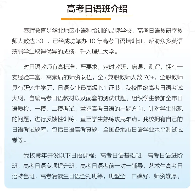 选择春辉高考日语,就是选择:✓ 权威教研团队全程护航✓ 经得起检验的课程体系✓ 个性化学习方案定制✓ 从基础到冲刺的全方位辅导