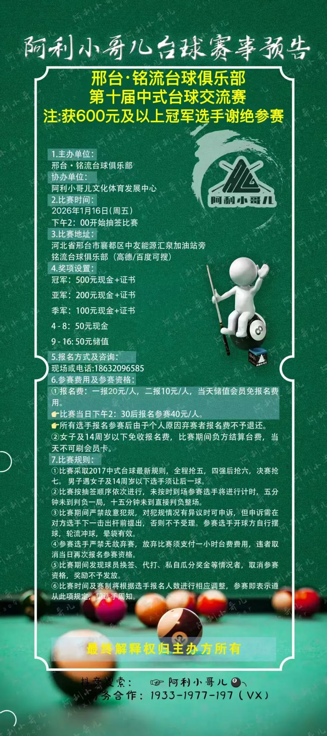 ①比赛采取2017中式台球最新规则,全程抢五,四强后抢六,决赛抢七。 男子遇女子及十四周岁以下选手须让后一球。