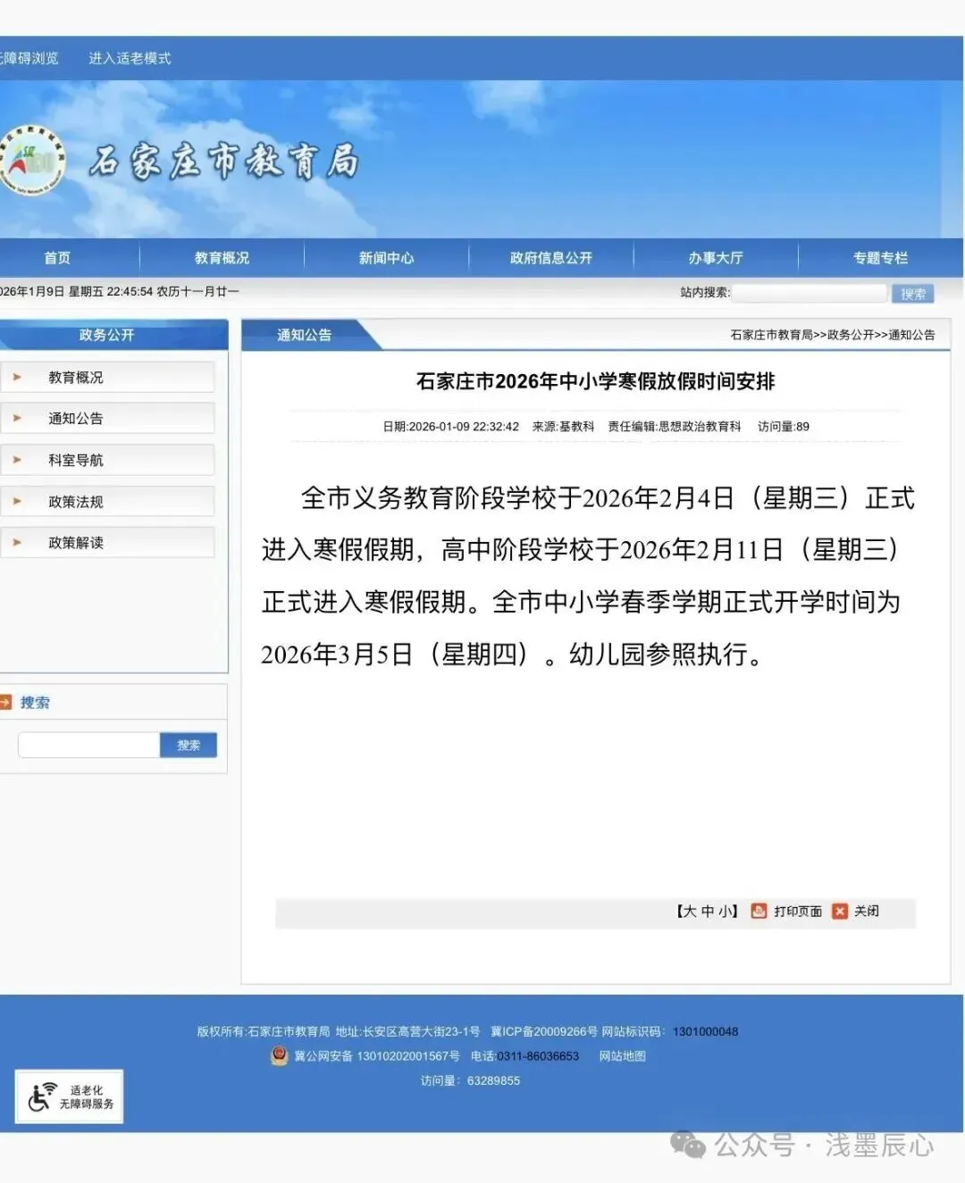 2026年2月4日(星期三)正式进入寒假假期,高中阶段学校于2026年2月11日(星期三)正式进入寒假假期。
