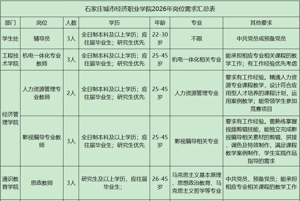 石家庄城市经济职业学院2026年公开招聘22名工作人员公告