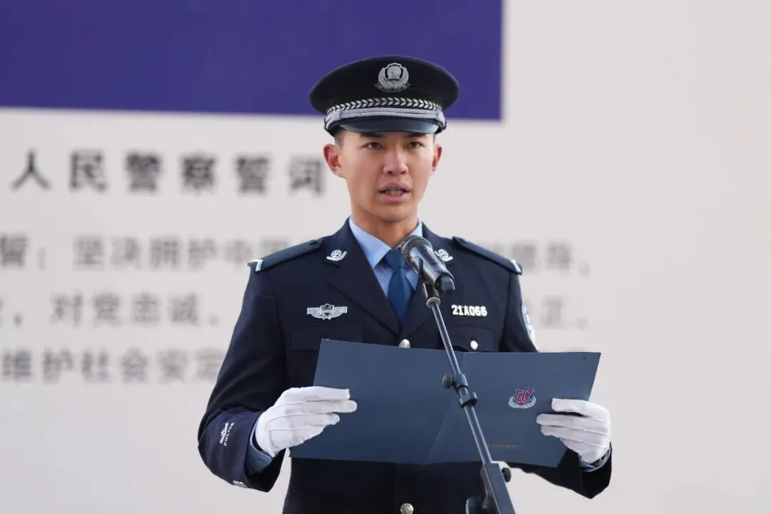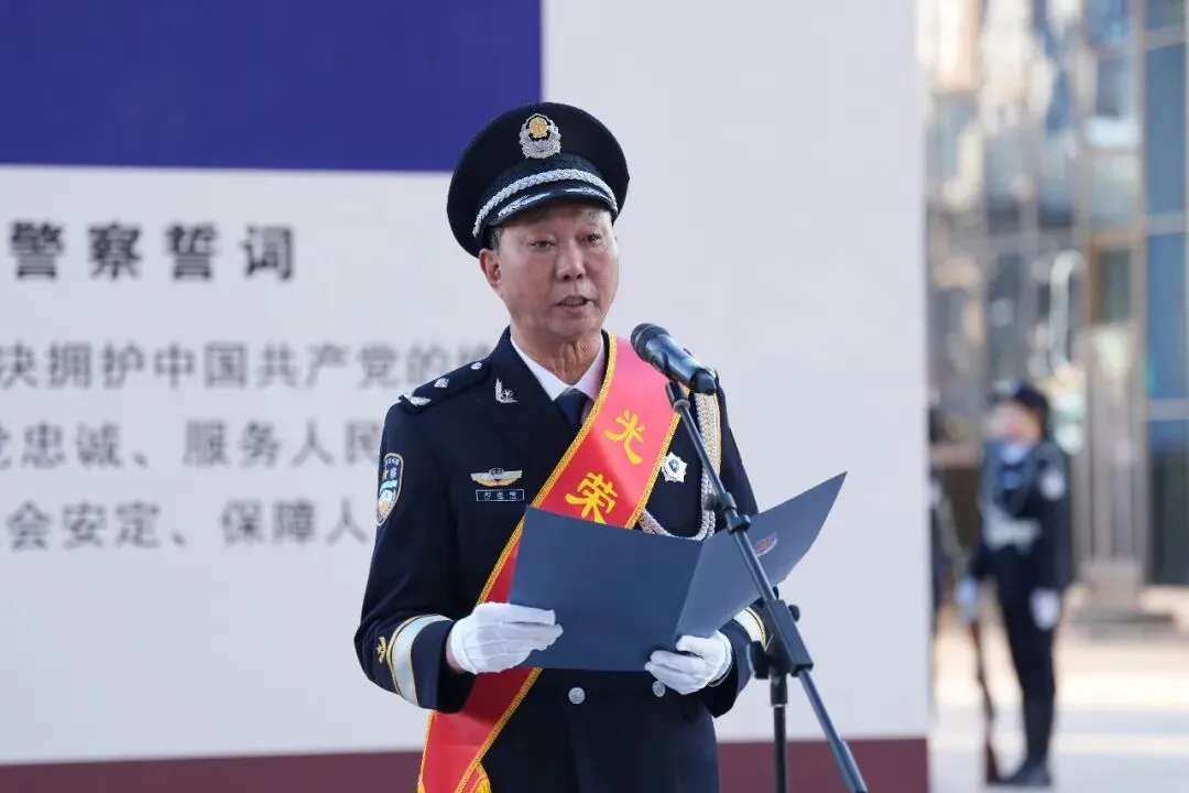 上午8时30分,活动正式开始。伴随着《激情燃烧的岁月》旋律,12名光荣退休民警代表列队入场,在《少年壮志不言愁》的歌声中依次传递警旗。新入警代表身姿挺拔、精神抖擞,迈着整齐划一的步伐走向荣退民警代表,郑重接过警旗并护送入场。随着“升警旗,奏警歌,向警旗——敬礼!”的号令,旗手振臂一挥。警旗在全体警员的注视下冉冉升起,迎风飘扬。“我是中国人民警察,我宣誓……”全体警员高声诵读《公安机关人民警察誓词》。铿锵有力的誓言响彻云霄,彰显了全体警员对公安事业的无限忠诚与热爱。随后,市局领导为荣退民警代表颁发纪念章并合影留念。荣退民警代表市第一看守所原一级高级警长刘占峰在发言中,深情表达了对警营的依依不舍与对新警的深切勉励。新警代表巡特警支队试用期民警高川皓庄严表态,将继承发扬前辈优良作风,用闪亮青春书写忠诚答卷。梁昆向光荣退休的战友致以崇高敬意,对新入警的同志们寄予殷切期盼。他指出,2025年,全市各级公安机关和全体警员团结一心、拼搏奉献,以忠诚之心、勇毅之志坚决扛起使命担当,打赢了一场又一场硬仗,战胜了一个又一个挑战,牢牢托起了千家万户的安澜与祥和;以创新之力、奋进之姿纵深推进公安改革,加速推动数智化转型升级,让石家庄现代警务体系的蓝图一步步变为现实。正是大家的不懈努力,让“幸福感”“安全感”成为了这座城市最深厚的底色。梁昆强调,2026年是中国共产党成立105周年,是全面实施“十五五”规划的开局之年,做好公安工作责任重大、使命光荣。全市各级公安机关和全体警员要深入学习贯彻党的二十大和二十届历次全会精神,积极践行“党有所指、民有所需、警有所应”,以只争朝夕的拼劲、敢为人先的冲劲、久久为功的韧劲,持续推动公安工作在更加广阔的领域、多元的场景中实现高质量发展,在加快建设现代化、国际化美丽省会城市的征程上再创辉煌、再立新功!