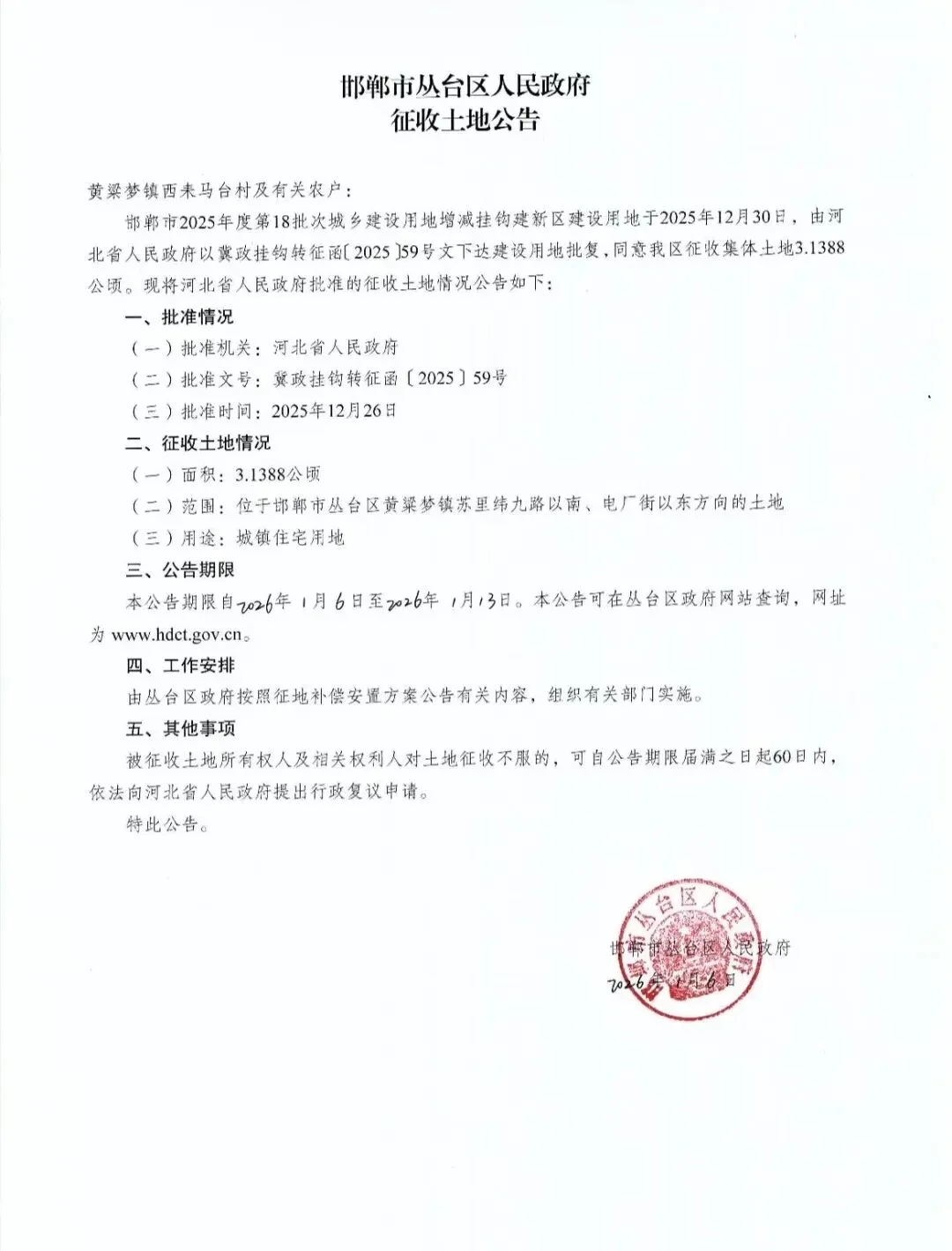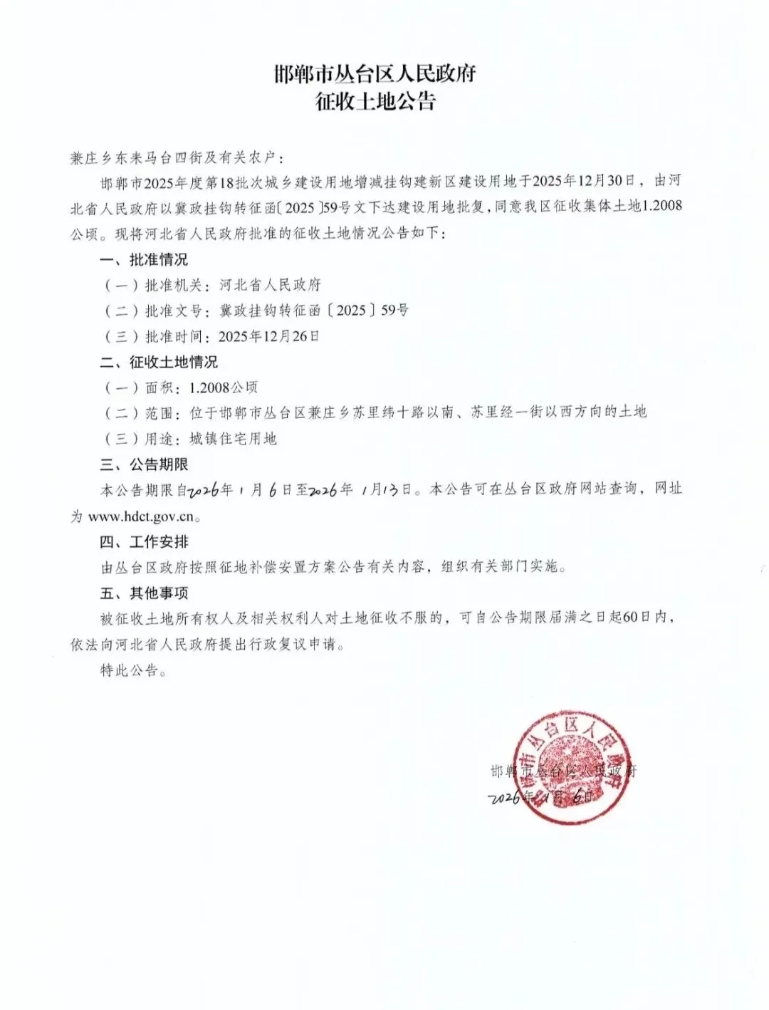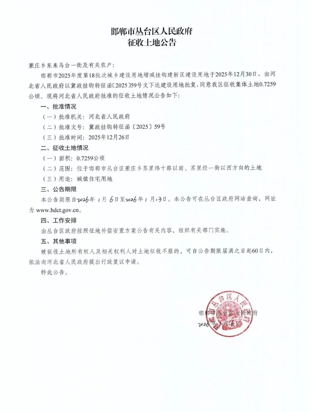 此次征地为邯郸市2025年度第18批次城乡建设用地增减挂钩建新区项目,已于2025年12月26日经河北省人民政府批准(批准文号:冀政挂钩转征函〔2025〕59号),2026年1月6日丛台区人民政府正式发布征收公告。