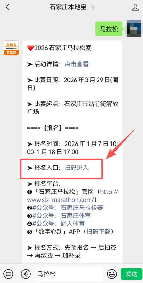 👉推荐服务:也可关注【石家庄本地宝】公众号,在聊天对话框回复【马拉松】,即可获取报名入口、活动详情、竞赛规程、精英运动员/视力障碍运动员/非竞速轮椅运动员报名指南及申请表下载入口等