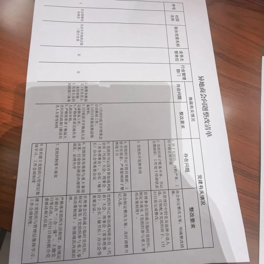 因商会存在连续三年年检不合格、一年未参加年检、逾期未完成换届选举等问题,近期已被北京市民政局社团管理中心约谈。参加了《市级行业协会商会换届事项整改集体约谈会》。针对上述问题,商会高度重视,深刻认识到自身在运营管理、制度执行等方面存在的不足,目前正严格按照北京市民政局社团管理中心的要求,全面推进整改工作,逐项梳理问题根源,制定具体整改措施,明确整改时限与责任人。