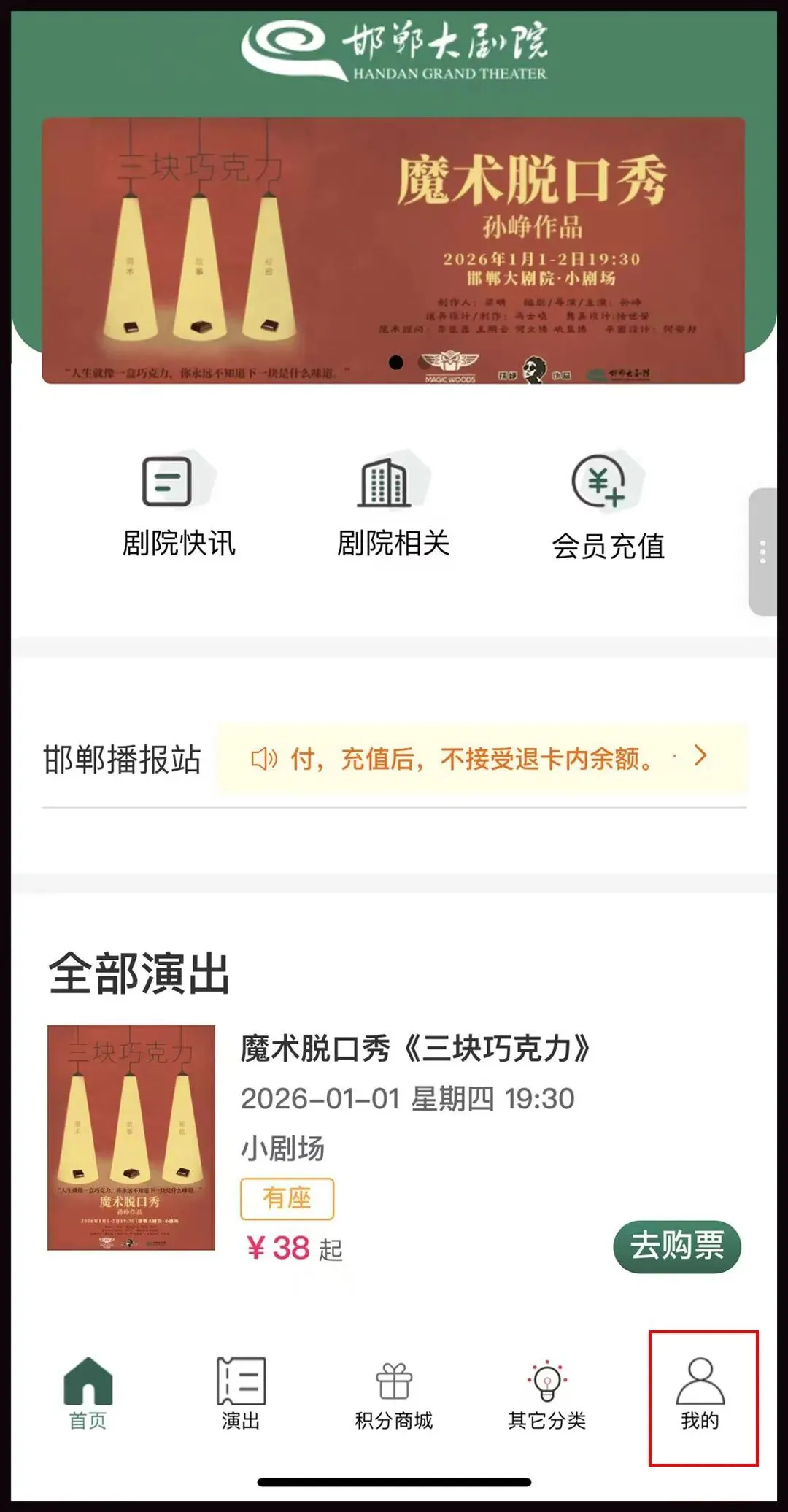 2026年1月12日10:00——2026年1月18日18:00,会员储值活动限时回归,充多少送多少!朋友们可以通过推文中购票小程序或在微信搜索「邯郸美玉大剧院」小程序进行充值。