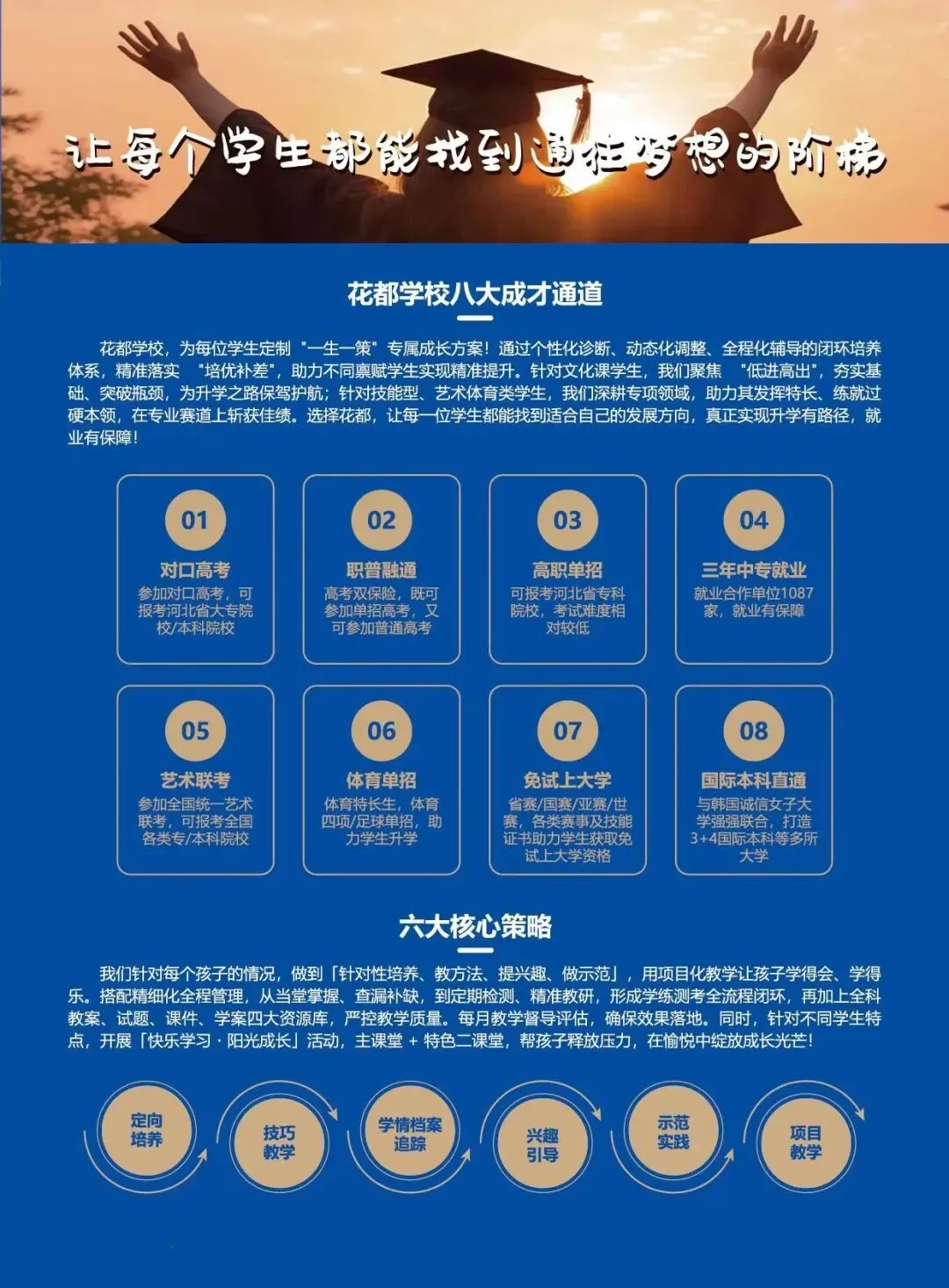 石家庄花都形象艺术学校始建于1994年,是经石家庄市教育局批准设立的全日制中等职业学校,现为省级重点中等职业学校,隶属于花都教育集团。建校三十一年来,以“提质培优、质量立校、专业塑校、管理强校”为办学方向,深耕职业教育领域,累计向社会输送各类优秀毕业生超10万人,赢得广泛行业赞誉与社会认可。