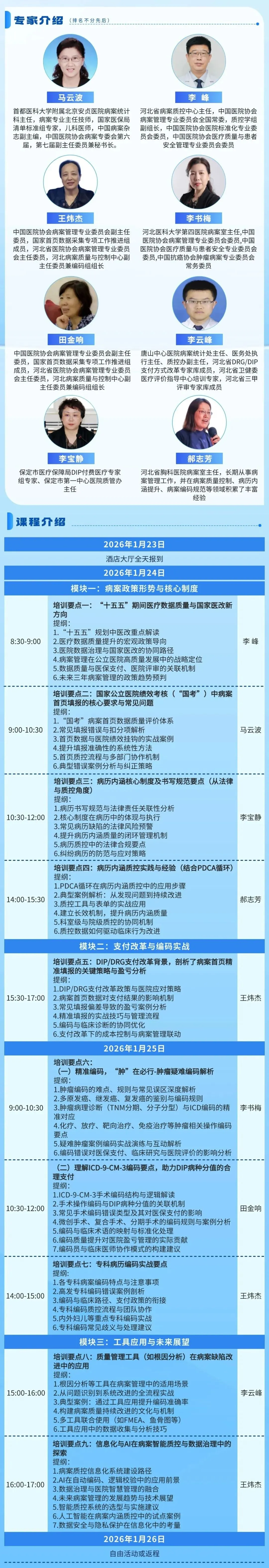 本次培训紧扣国家最新政策导向,聚焦病案管理中的难点、痛点与热点问题,邀请国家级、省级权威政策研究与质控专家团队,采取“政策解读+实战案例+工具演练+互动答疑”相结合的模式,助力医院打造一支懂政策、精编码、善质控、会管理的病案专业队伍。具体事宜如下: