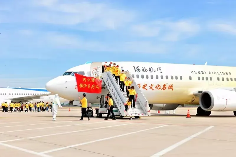 5月14日10时许,河北省支援上海医疗队在上海圆满完成核酸检测支援任务后,全体队员搭乘包机抵达正定国际机场,平安凯旋。