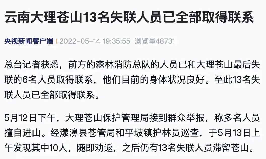 据央视新闻客户端消息,前方的森林消防总队的人员已和大理苍山最后失联的6名人员取得联系,他们目前的身体状况良好。至此13名失联人员已全部取得联系。