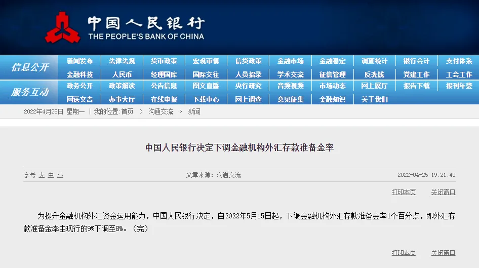 日本国内25日出现首例不明原因儿童急性肝炎病例。据日本广播协会(NHK)报道,与此前在欧美出现的多数病例不同,这名病患并未检测出腺病毒。为提升金融机构外汇资金运用能力,中国人民银行决定,自2022年5月15日起,下调金融机构外汇存款准备金率1个百分点,即外汇存款准备金率由现行的9%下调至8%。