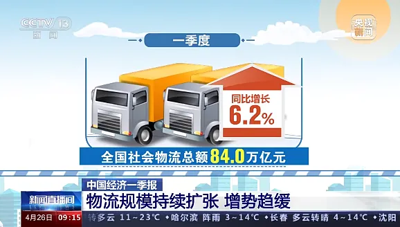 一季度全国社会物流总额84.0万亿元,同比增长6.2%。从规模看,社会物流总额与GDP的比率回升至3.1,为2020年以来的最高水平,显示多重压力下,物流需求为经济发展提供了有力保障。