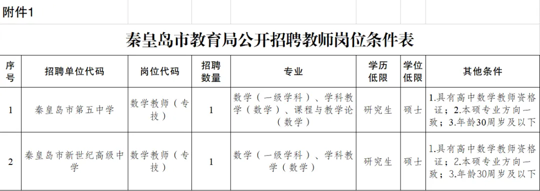 秦皇岛市第五中学等2所学校公开招聘教师,岗位要求详见《秦皇岛市教育局公开招聘教师岗位条件表》。