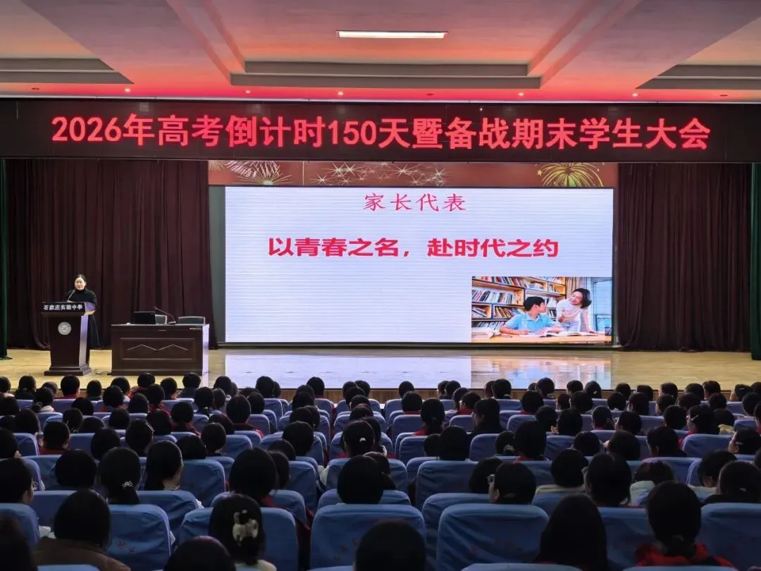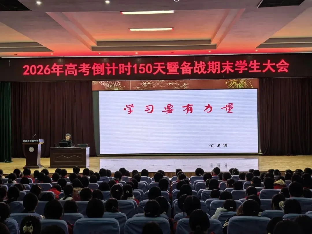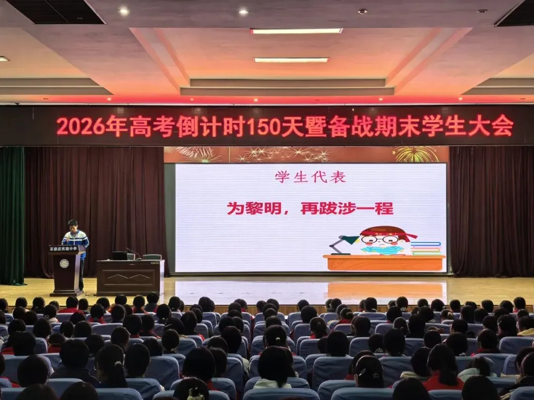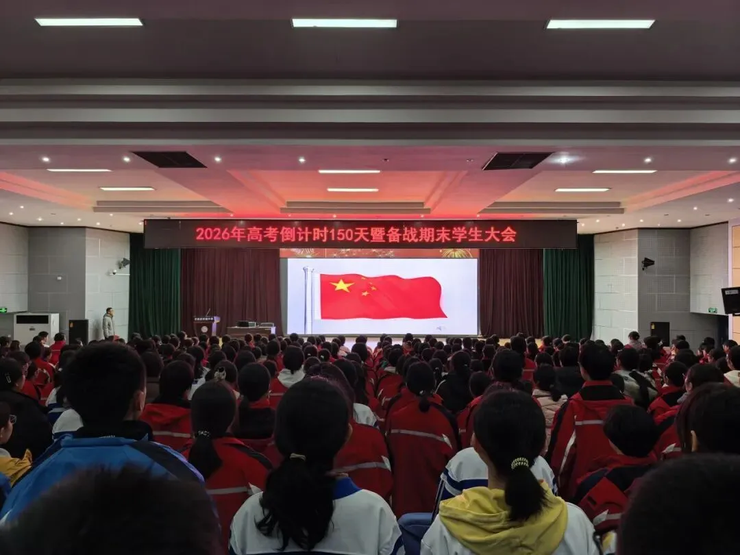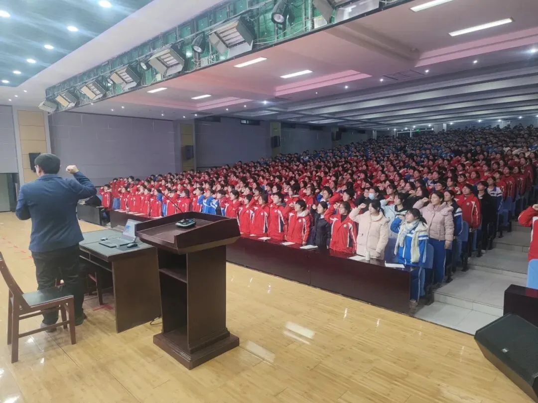 2026年1月8日下午16点,23级师生齐聚报告厅,隆重举行2026年高考倒计时150天暨备战期末学生大会。此次大会由年级部副主任霍伟亮主持,全体班主任和高三学生参会。会议共分五项议程:学生代表发言、家长代表发言、班主任老师发言、年级主任发言、宣誓。