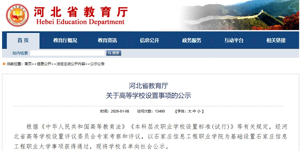 根据《中华人民共和国高等教育法》《本科层次职业学校设置标准(试行)》等有关规定,经河北省高等学校设置评议委员会专家考察和评议,以石家庄信息工程职业学院为基础设置石家庄信息工程职业大学事项获得通过,现将学校名单向社会公示。